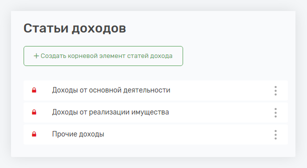 Данные статьи являются часто используемыми в учете, поэтому они заранее предусмотрены в системе. Эти статьи доходов нельзя удалить из списка, но они доступны для редактирования. Можно создавать и редактировать собственные статьи доходов.