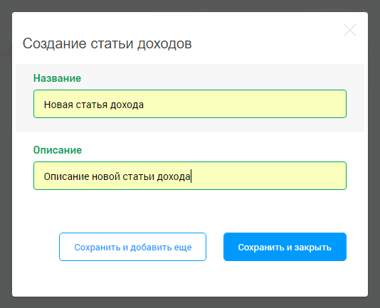 Заполните поля «Название» и «Описание». Нажмите на кнопку «Сохранить и закрыть». Для того, чтобы добавить еще одну статью, нажмите на кнопку «Сохранить и добавить еще». Статья дохода успешно создана!