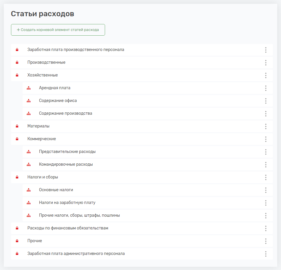 На открывшейся странице вы увидите предустановленные статьи расходов, с входящими в них подстатьями: