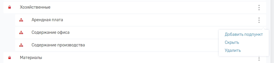 Корневые элементы статьи расходов нельзя удалить из системы, в отличие от подстатей. Чтобы удалить ненужную подстатью, нажмите на кнопку действий в строке с подстатьей и выберите команду «Удалить».
