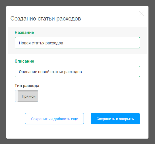 Заполните поля «Название» и «Описание». Обратите внимание: вы можете менять тип расхода статьи с прямого на косвенный, путем нажатия на переключатель «Тип расхода». Нажмите на кнопку «Сохранить и закрыть».