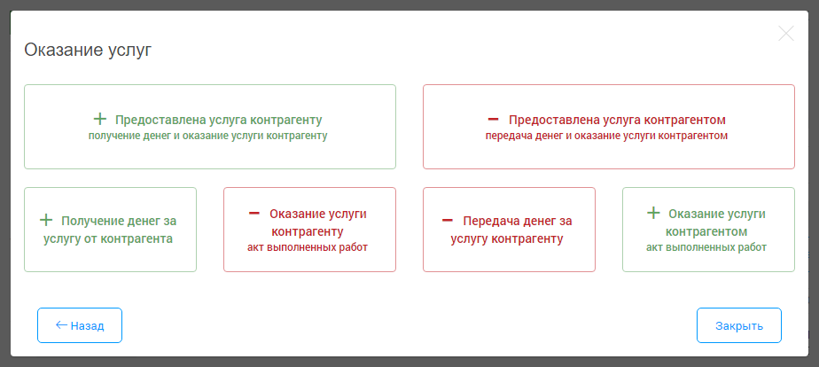 Группа операций «Оказание услуг» отражает взаимодействие с поставщиками и покупателями вашего бизнеса по оказанию услуг.