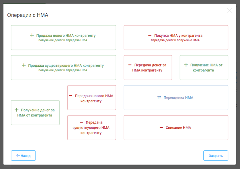 В состав операции с НМА входит три группы операций – «Продажа нового НМА контрагенту», «Продажа существующего НМА контрагенту» и «Покупка НМА у контрагента», включающие в себя следующие операции: